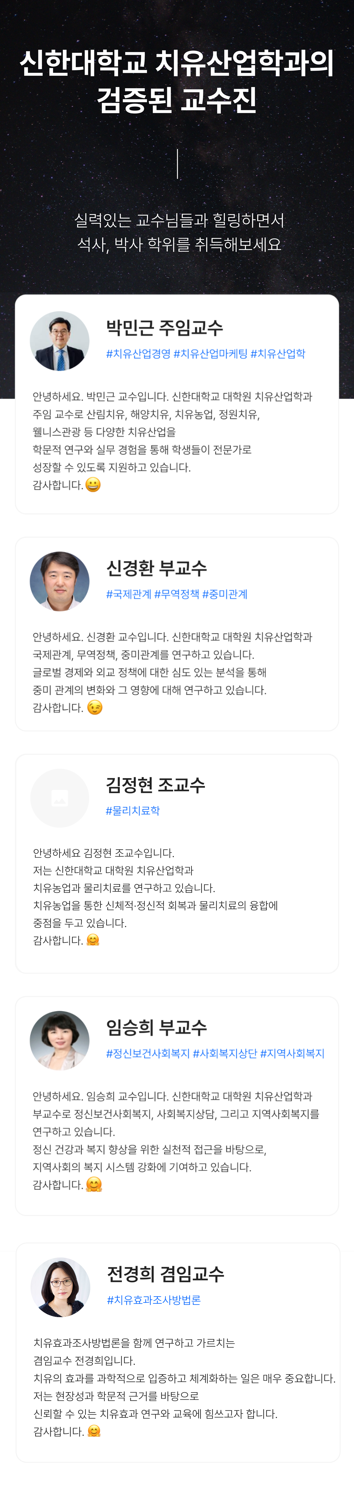 신한대학교 대학원 치유산업학과는 (사)한국치유농업협회와 업무협약을 통해 만들어진 학과입니다. 그래서 상담부터 진행하여 입학절차를 상세히 안내해 드립니다. 아래의 연락처로 전화 주세요.